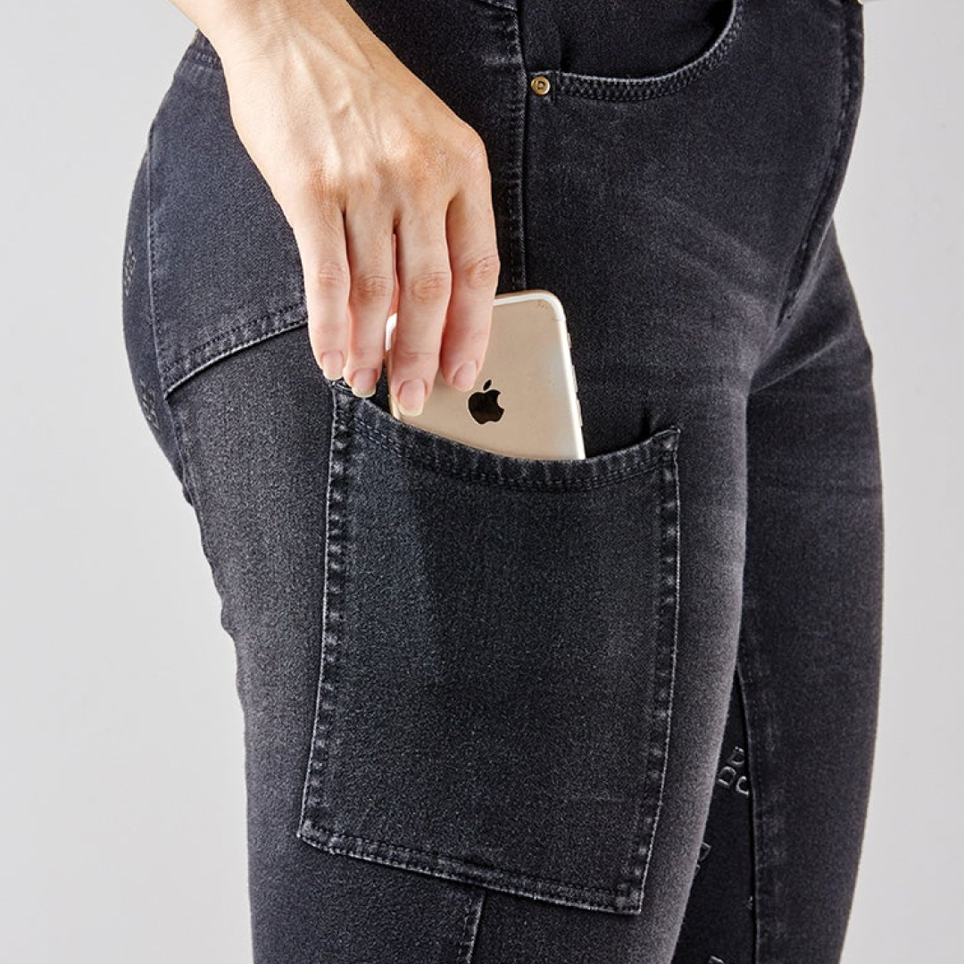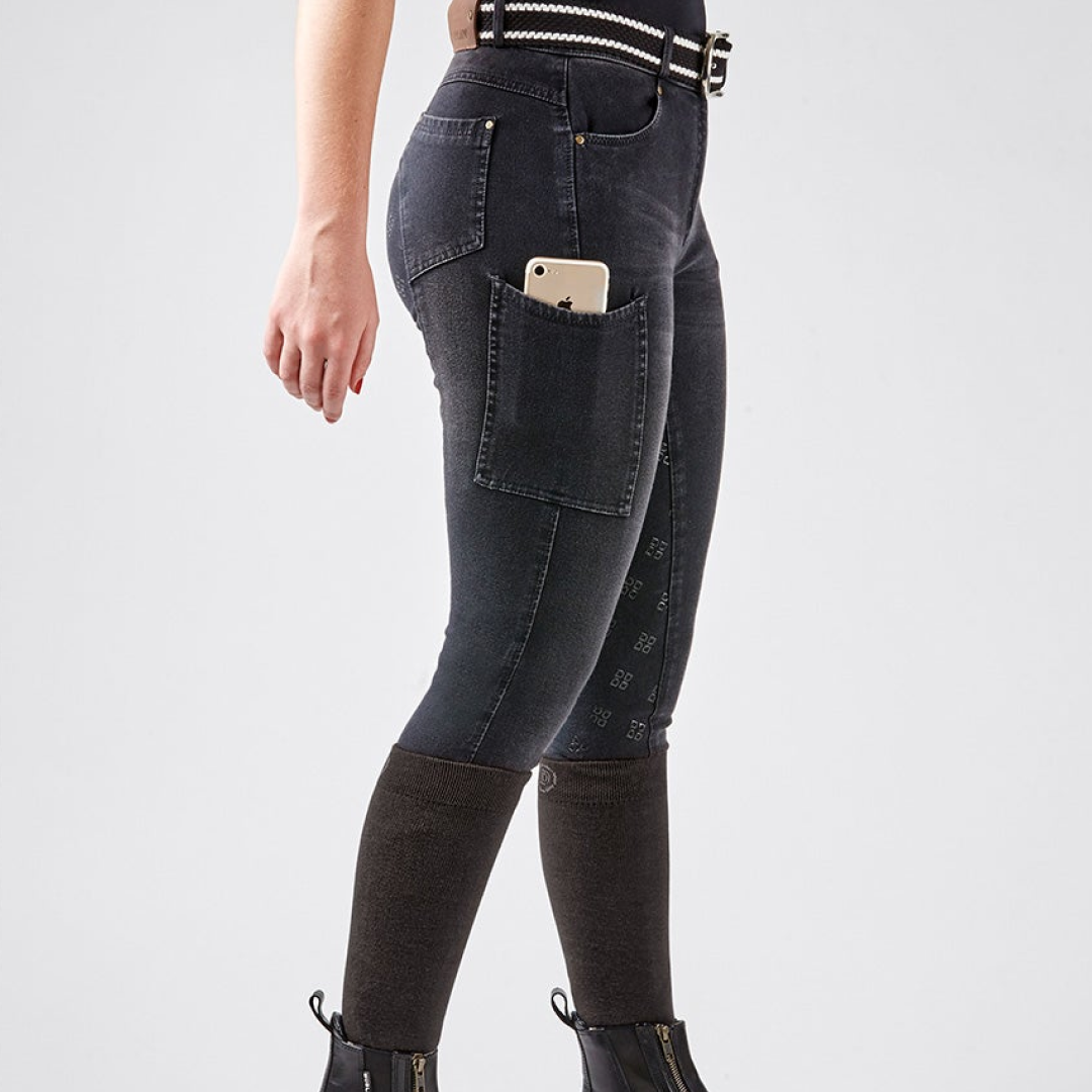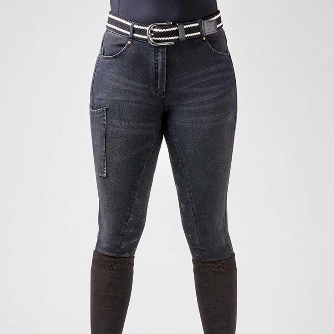Vintage wash denim look breeches with silicone (PU) grip gel full seat made from a bi-stretch denim fabric offering compression and coverage. Featuring 4 jean style pockets plus a handy outer side phone pocket on right leg. Suede belt loops for that stylish riding look wirh front zip snap closure in a mid rise stlye with no gap waistband.