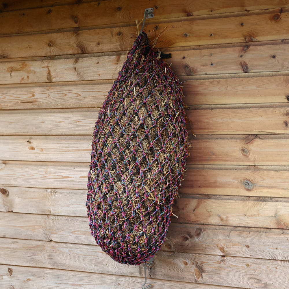 The Hy Equestrian Slow Flow Ultra Haynet is perfect for greedy feeders, those on a diet or horses that need their ad lib forage controlled. This double layered haynet is individually crafted with small holes to slow hay consumption and trickle feed your horse or pony, ensuring better digestion and less waste on the floor. Durable and practical, this haynet will hold approximately 7kg of dry hay. 4cm holes.