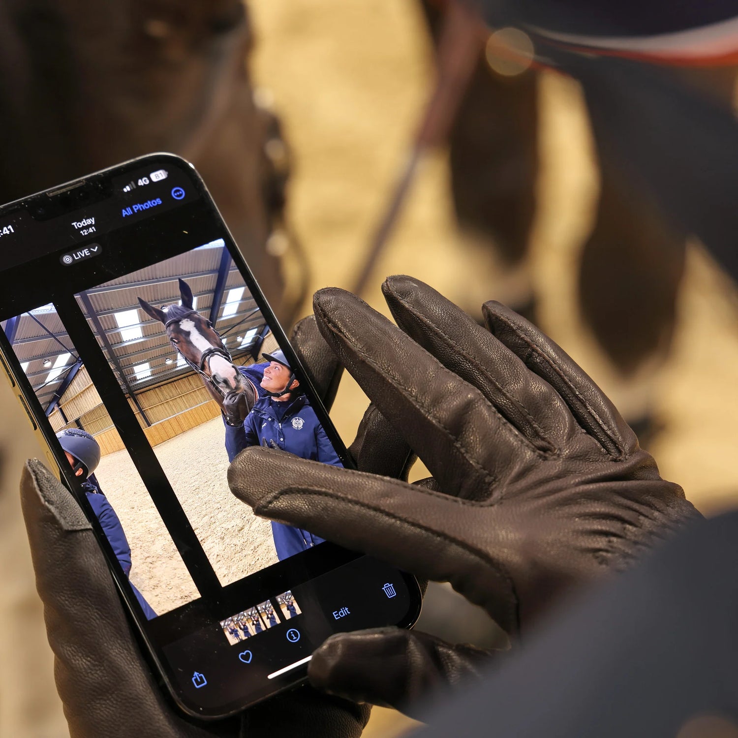 Premium quality Aubrion Estade leather riding gloves are hand crafted in show-smart soft goat leather for comfort and style. The gloves offer an elegant fit, unlined for closer contact and offering naturally non-slip leather palms. Touchscreen compatible index finger and thumb. non-scratch touch close fastenings at the wrist, reinforced riding grips, stretch stitching and burnished Aubrion badge.