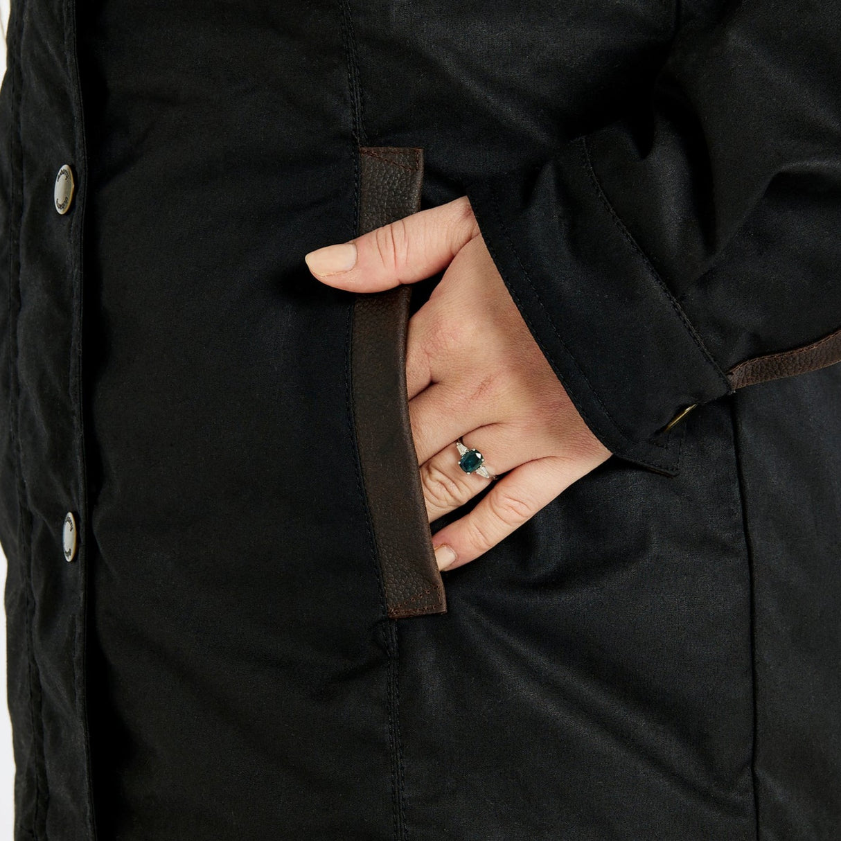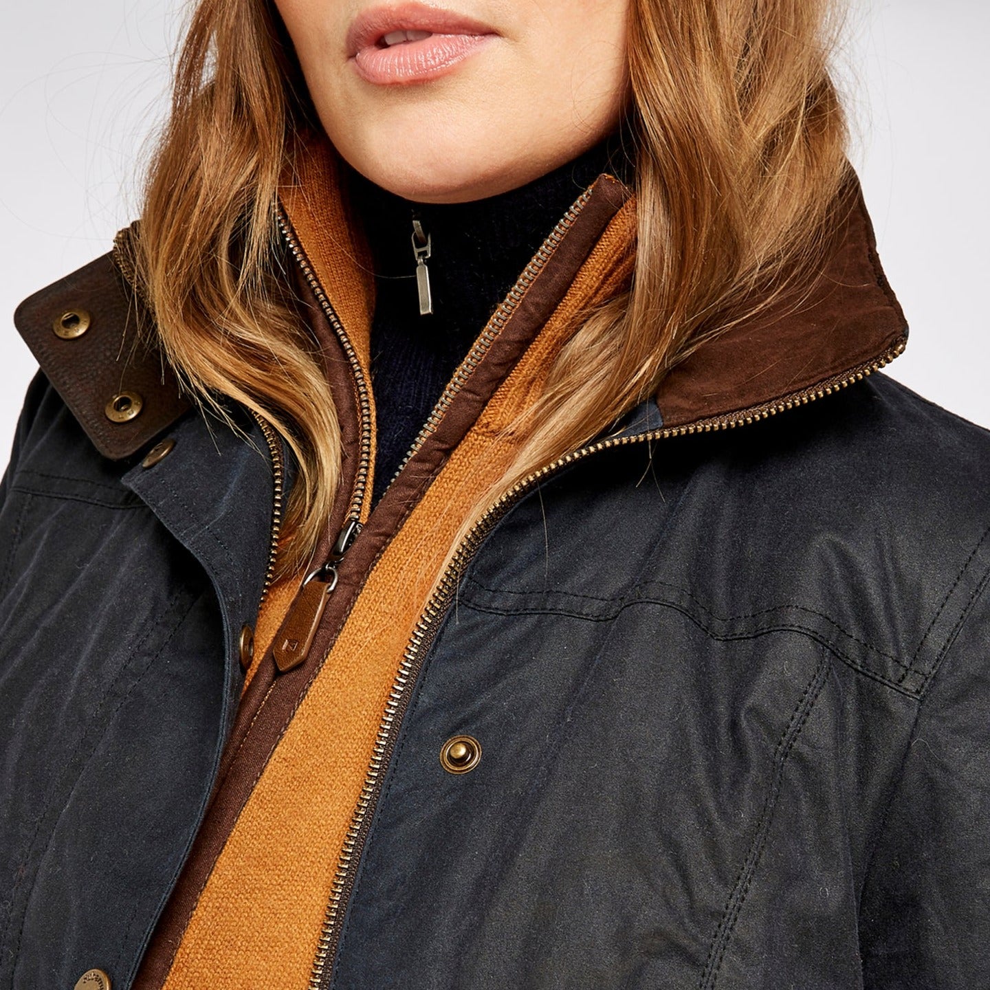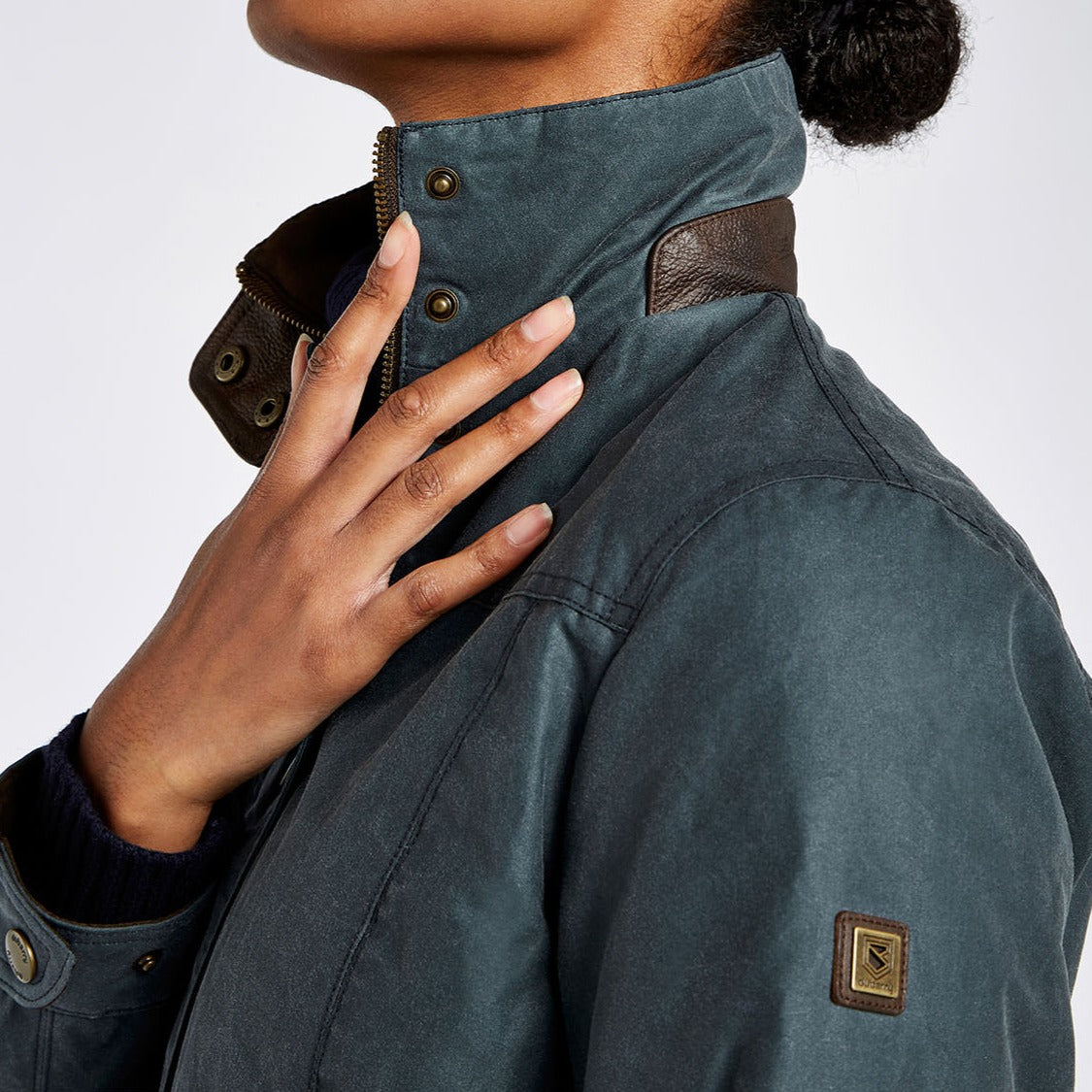The waxed cotton Dubarry Mountrath is a warm winter jacket with PrimaLoft fill and water repellent finish - perfect for braving wet and windy days in. The leather trim and branded stud poppers lean into a traditional, elegant aesthetic while the stud-fastened faux suede collar and soft, flattering tailoring add a slick urban flair to this comfortable country style.