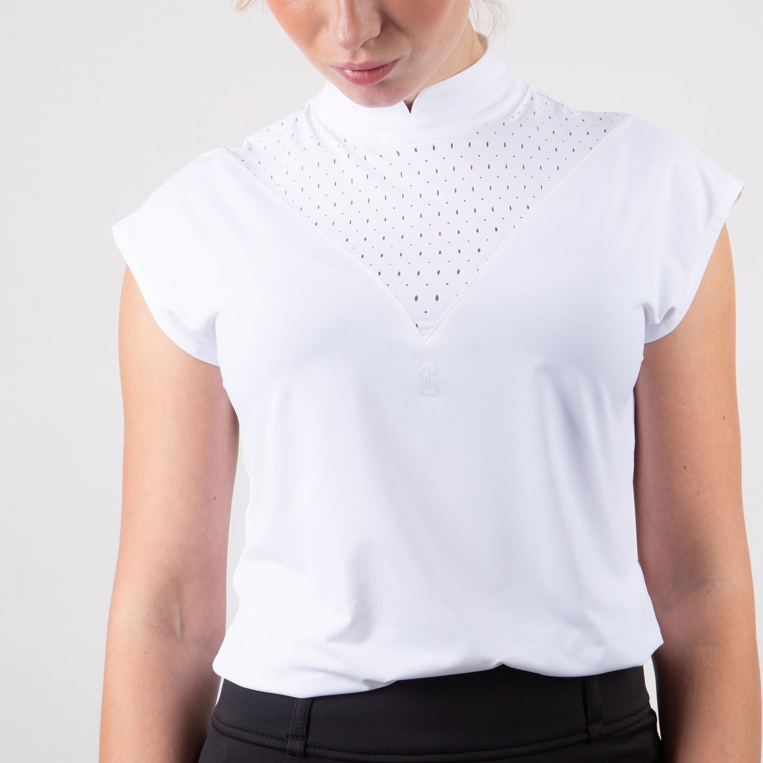 The PS of Sweden Dahlia Sleeveless Competition Top is a must-have for any competition rider. With breathable, quick-drying fabric and a laser-cut pattern inspired by Broderie anglaise, it keeps the rider cool and comfortable while adding a touch of style. Featuring ventilation, a double collar stand, and superior quality, this shirt is both functional and fashionable.