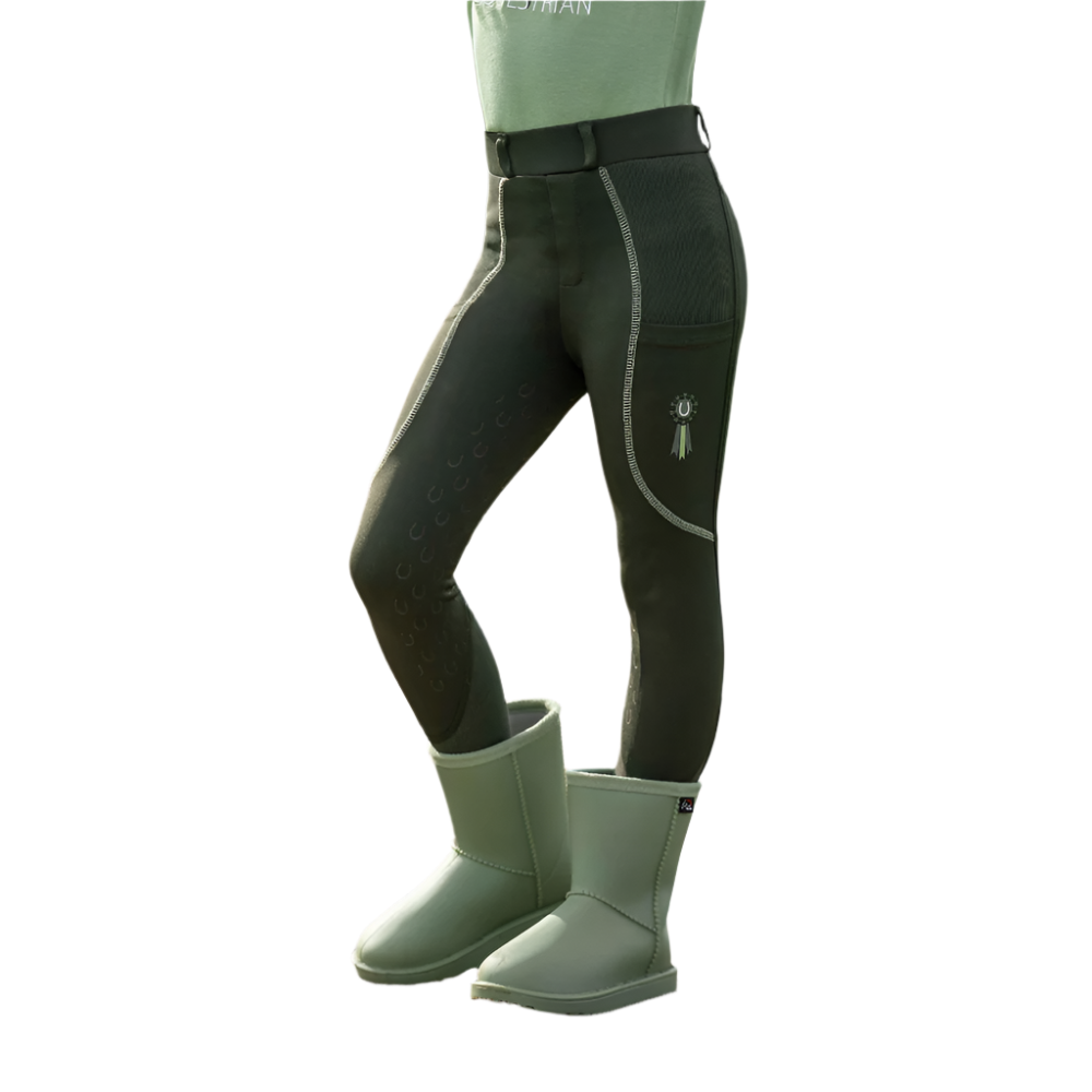 The riding leggings Claire for children combine comfort, functionality and a lovely design. Thanks to the silicone full seat with small horseshoes, they offer optimum support in the saddle, while the elasticated leg cuffs with knitted inserts ensure a perfect fit. Two side slit pockets provide space for small essentials, while the practical belt loops allow for a customised fit. A special highlight is the delicate show bow as a small print - a playful detail that rounds off the sporty look. With the riding leggings Claire, young riders are perfectly equipped for every training session!