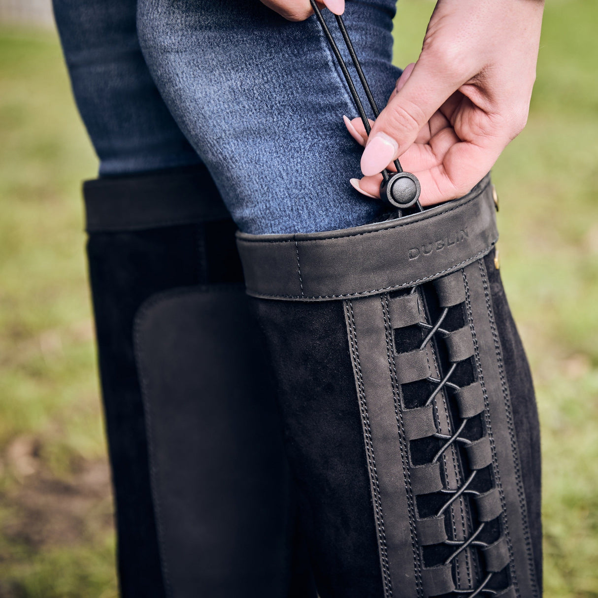 • Premium full leather upper, ensuring durability. The side lace adjustment and touch tape closure allow for easy accommodation of various calf widths.