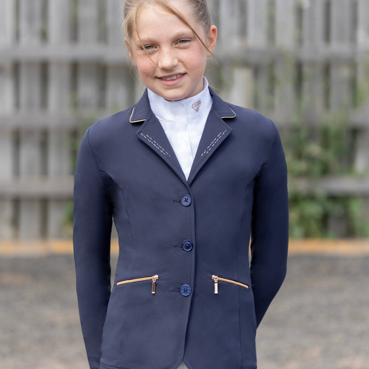 Hy Equestrian Cadiz Mizs Turnierjacke für Kinder - Marineblau/Roségold / 7-8 Jahre ist auf Lager und wird versandt, sobald es wieder verfügbar ist