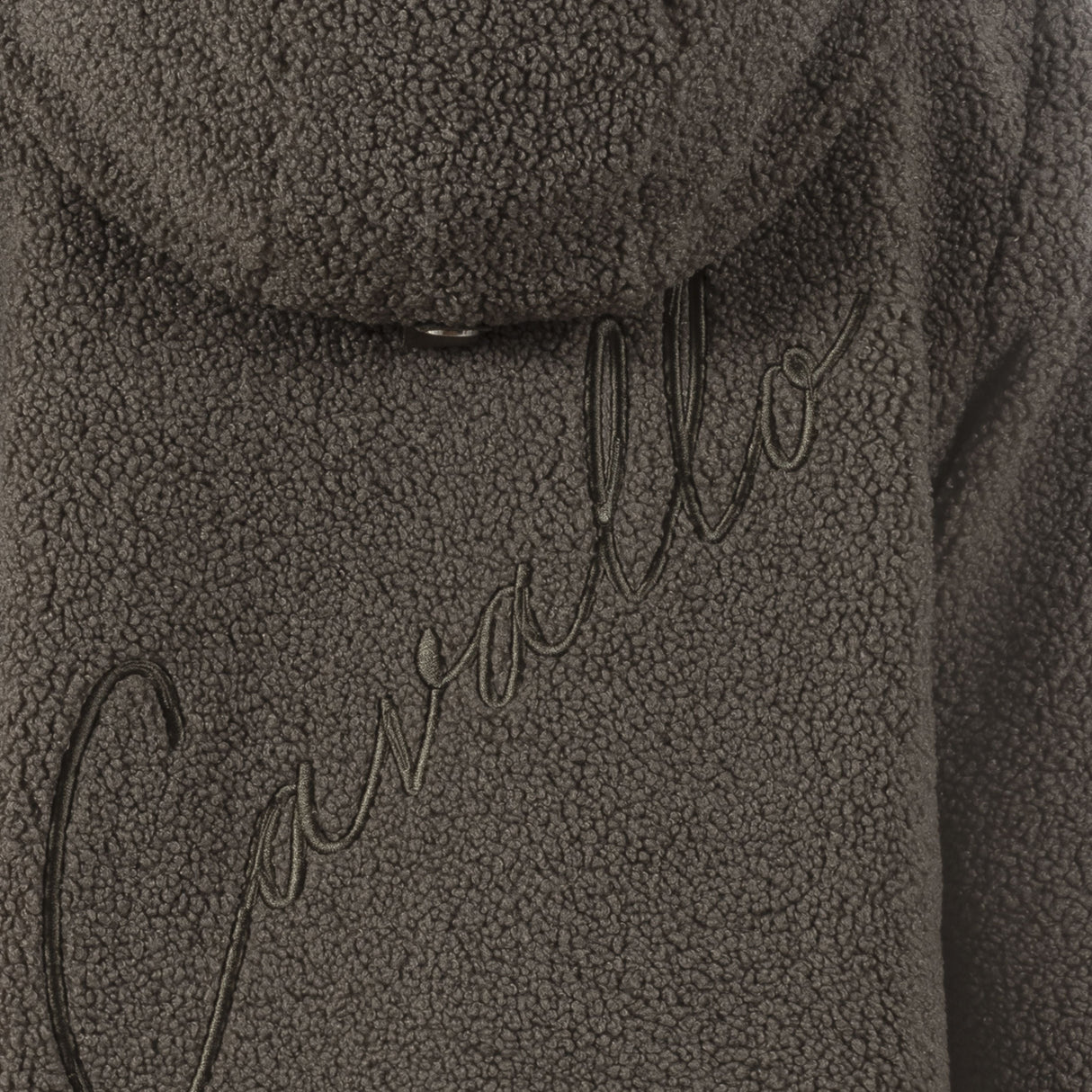 The Cavallo Melena Hoody Jacket is a luxurious and comfortable fleece jacket, featuring a soft teddy fleece lining with velvety woven fur inside the hood and tonal cords. It also includes a diamond quilted lining, a 2-way front zip with the iconic Cavallo zip pull, and two front pockets with zippers for added convenience. The left chest is adorned with a subtle Cavallo 3D stirrup embroidery, while a large, tonal Cavallo embroidery is placed diagonally on the back. The high-quality Cavallo label is also present on the back edge of the hood and on the left side seam.