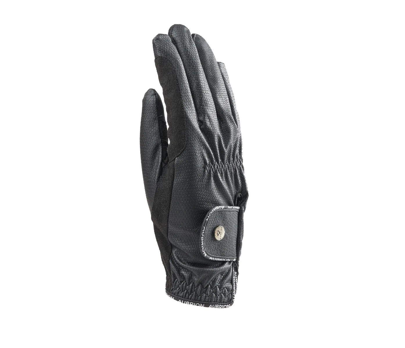The DuraGrip palm provides a secure wet or dry hold on the reins, a close contact feel gives greater connection. Touchscreen compatible forefinger and thumb ensures convenience on the go. Thumb articulation and stretch fabrics give a free feel, stitch gathered across the knuckles for flexion. Deep wrist openings have non-scratch touch close fastenings, the elasticated cuff edge gives a neat fit. Finished with signature trims and a burnished Aubrion badge.