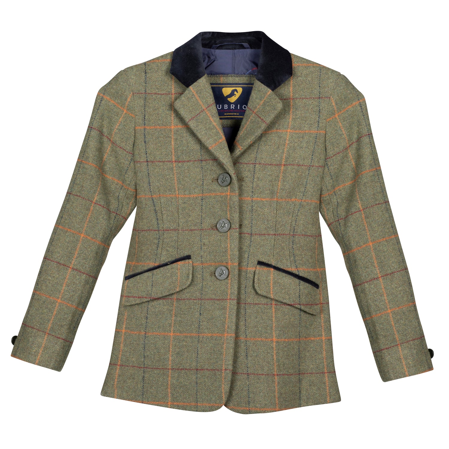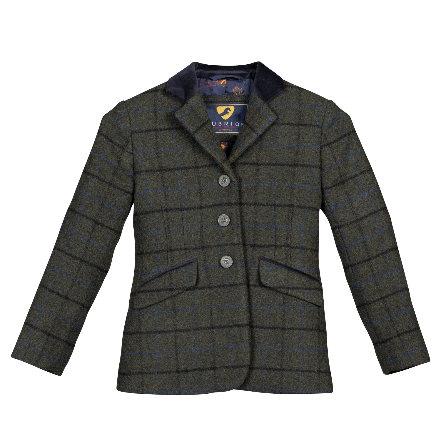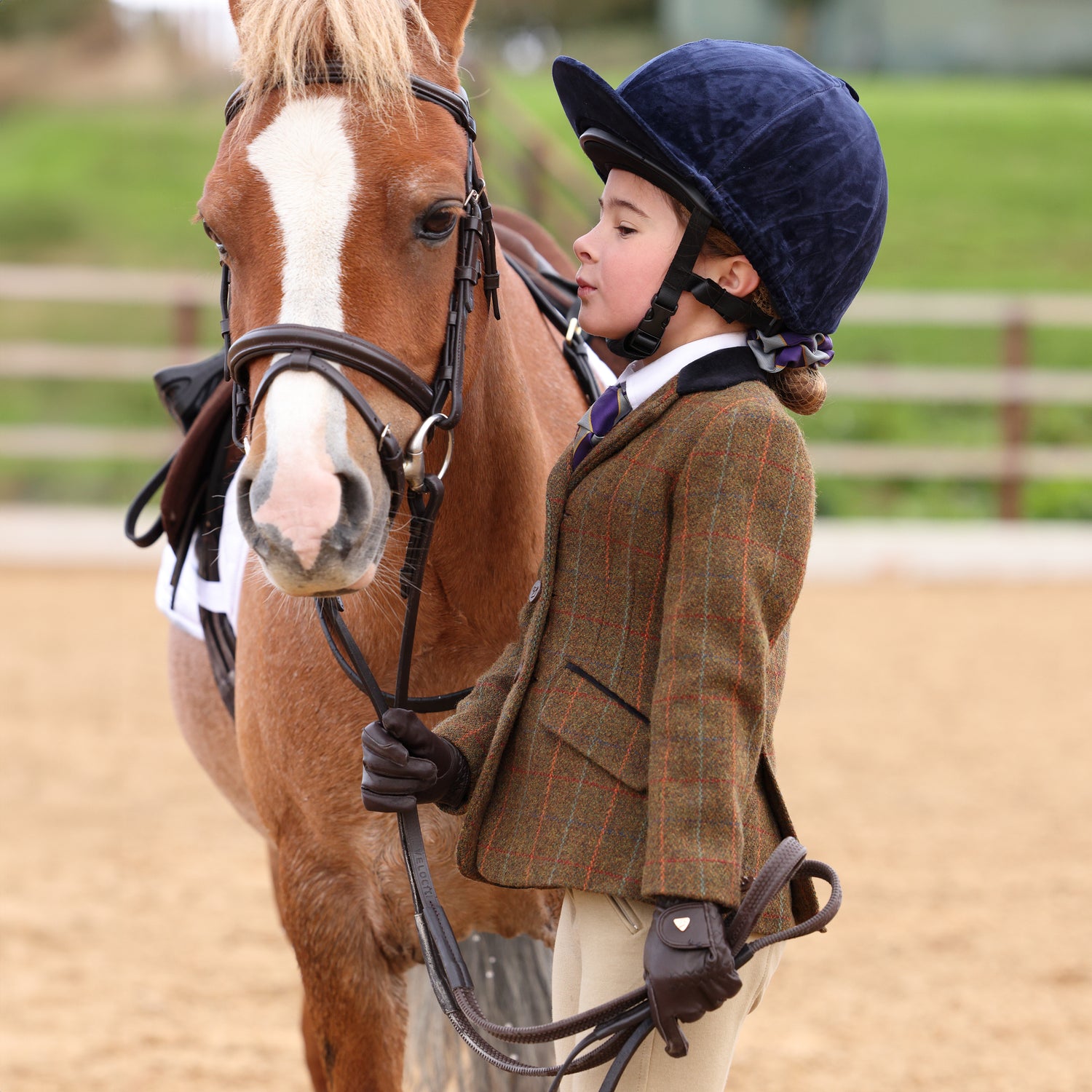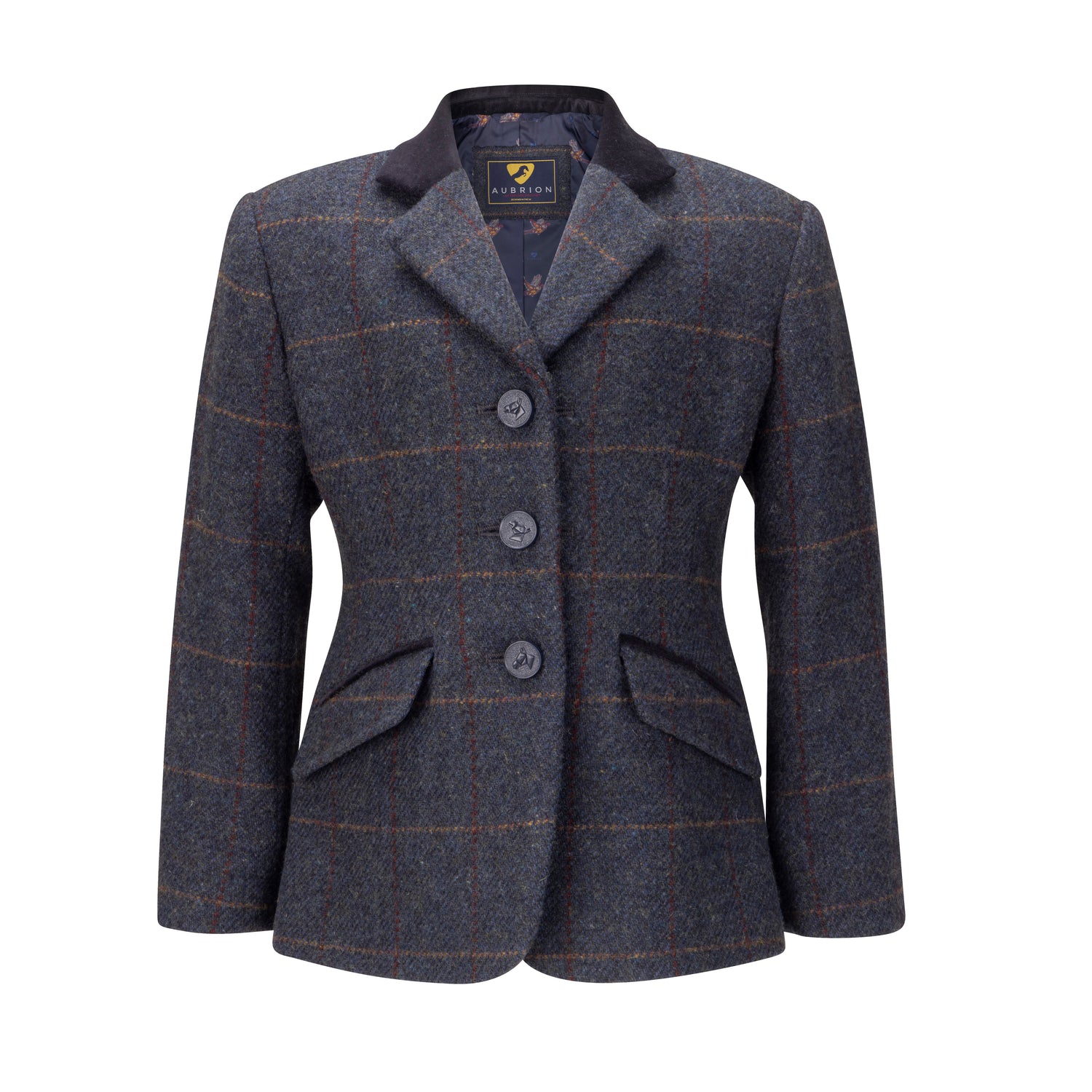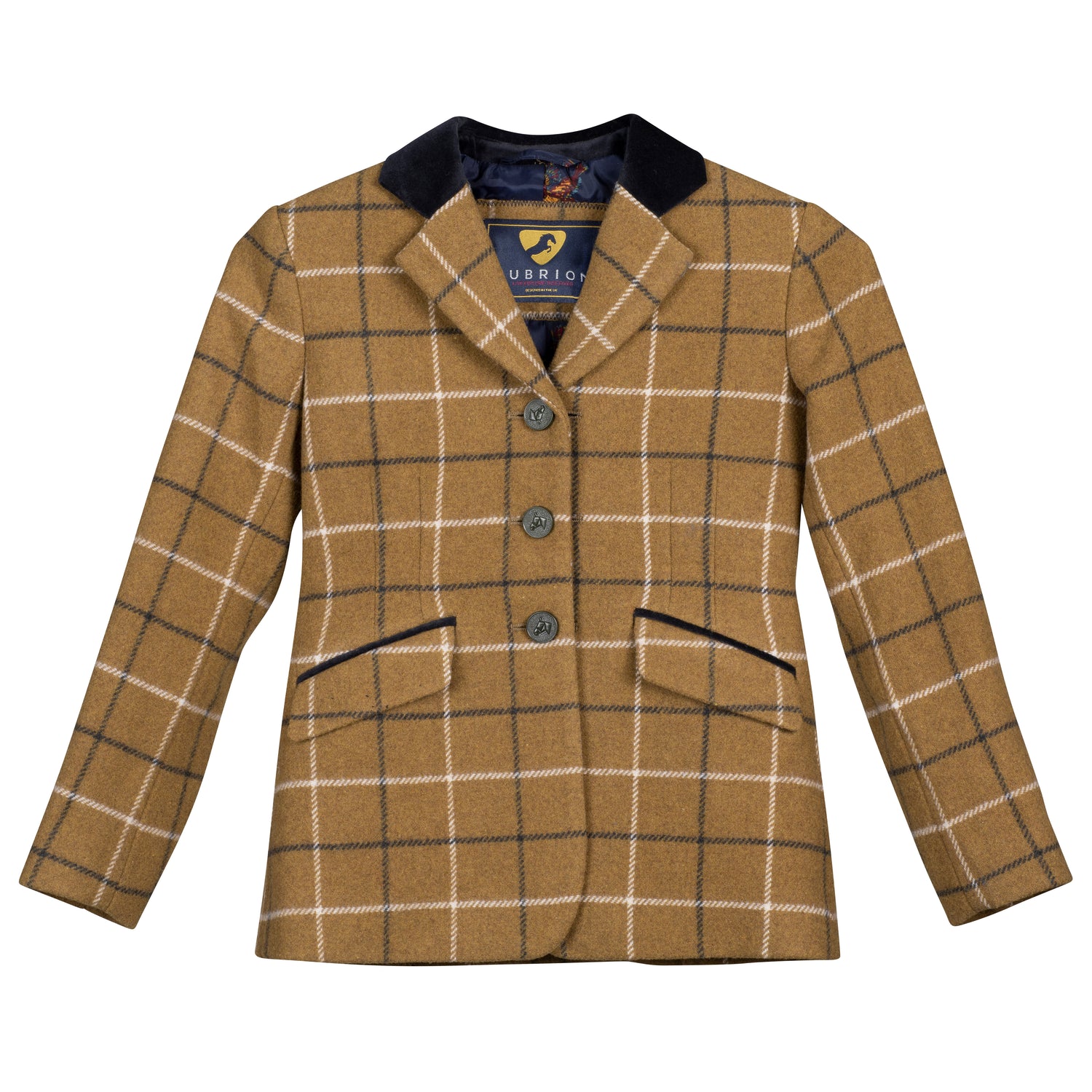 Une veste de concours classique traditionnelle avec une coupe fraîche et moderne à carreaux en tweed mélangé de laine. Le détail style : coupe ajustée, col et poches bordés de velours, doubles fentes arrière, détails de boutons cheval, deux poches à rabat, doublure imprimé faisan, marque Aubrion. Double fermeture pour garçon ou fille.