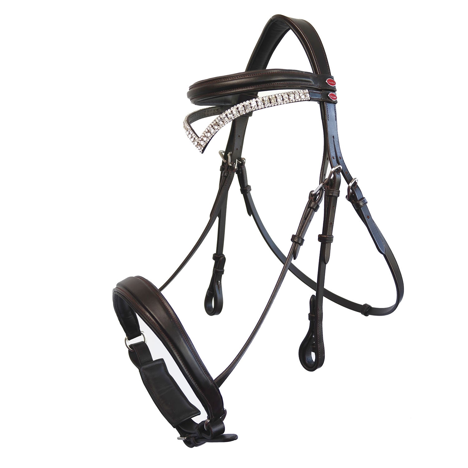 Livré avec un frontal surélevé de tous les jours et un frontal orné de diamants - parfait pour les spectacles ! Rênes vendues séparément. Le cuir souple a une finition naturelle et le frontal et la muserolle sont tous deux rehaussés d'une surpiqûre ton sur ton.