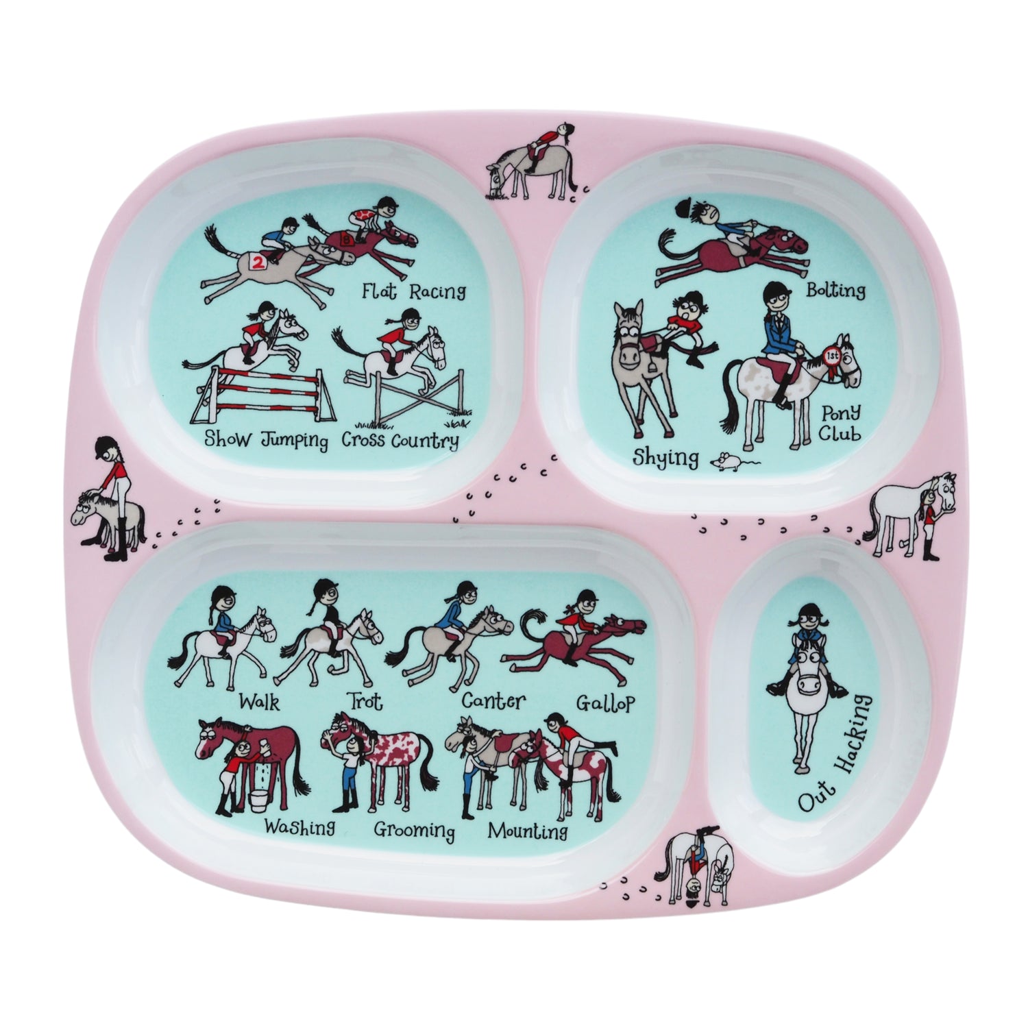Hy Equestrian have teamed up with Tyrrell Katz to bring you an adorable range of children's tableware! The divider plate features four sections including a round cup holder. The plate is adorned in fun horse illustrations to make dinner times fun! Perfect for at home or to take to camps and stay away shows. Dishwasher safe, made from 100% Melamine and BPA free too.