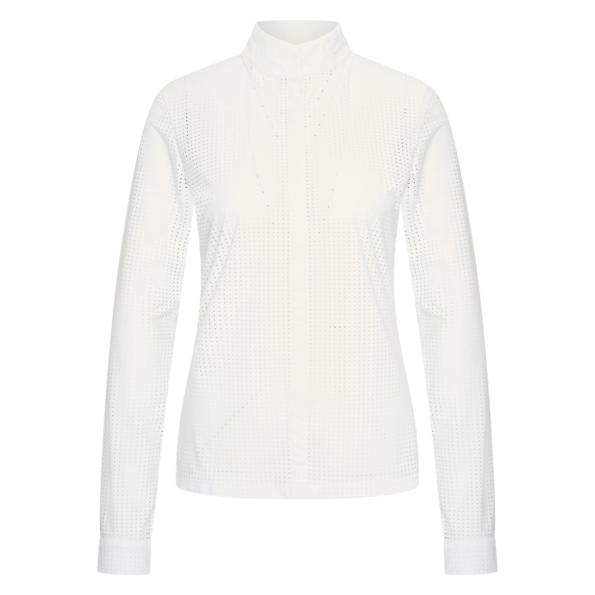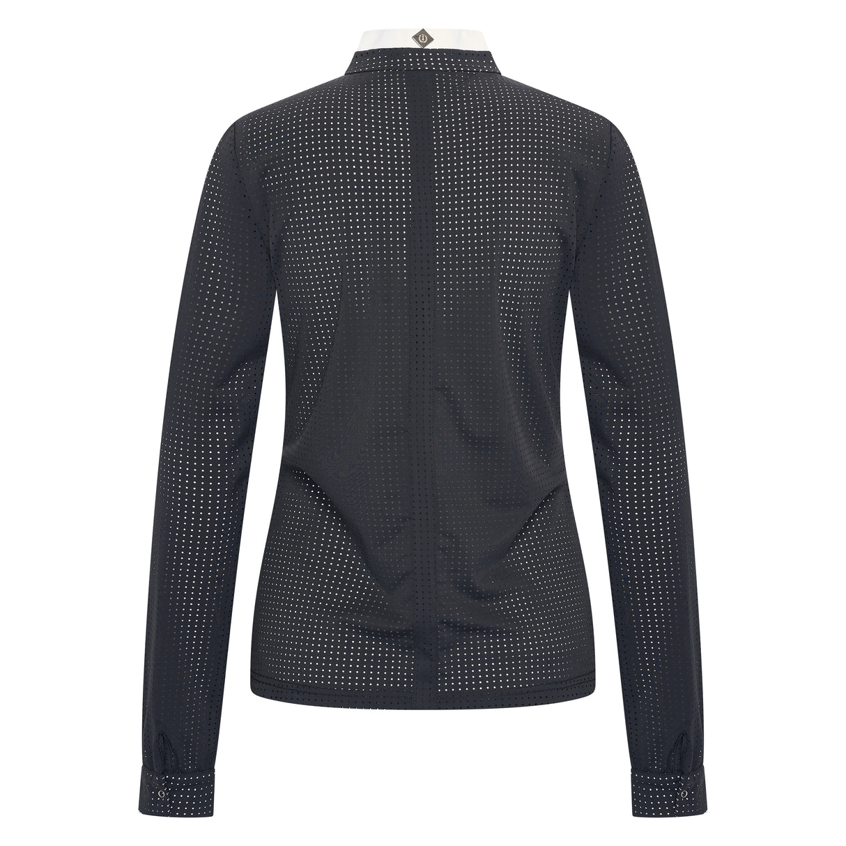 Elevate your competition look with the sleek and stylish Children's Long Sleeve Top. Designed with perforated fabric for comfort and functionality, this top features a sophisticated cuff with a small snap button and a functional but discreet button enclosure. The white collarstand is accented with two small snap buttons for added flair, while the metal IMPERIAL RIDING plate and fancy fabric stripe add a touch of elegance. Stand out in style and comfort with the premium top.