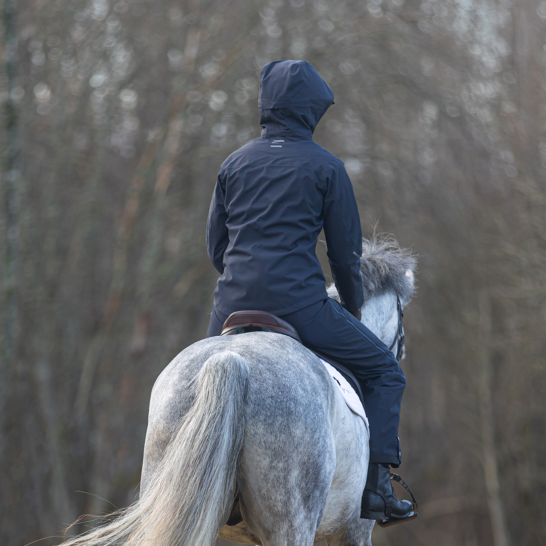 EquTex™, tissu polyester recyclé 2 couches avec membrane imperméable et respirante. Imperméabilité 20 000 mm / Respirabilité 20 000 g/mm2/24h. Le tissu extérieur est doté d'un traitement DWR écologique sans fluorocarbone.