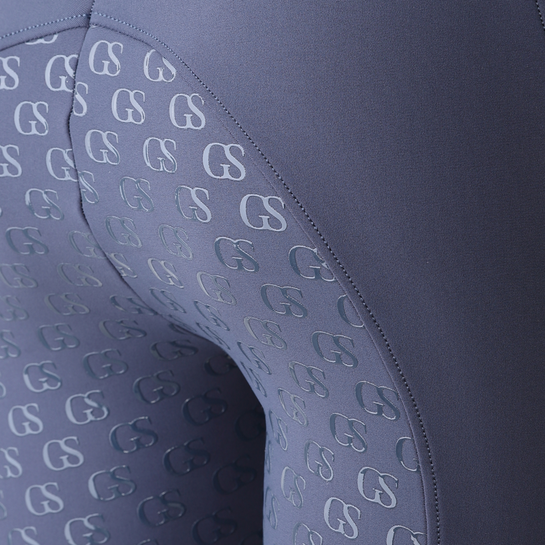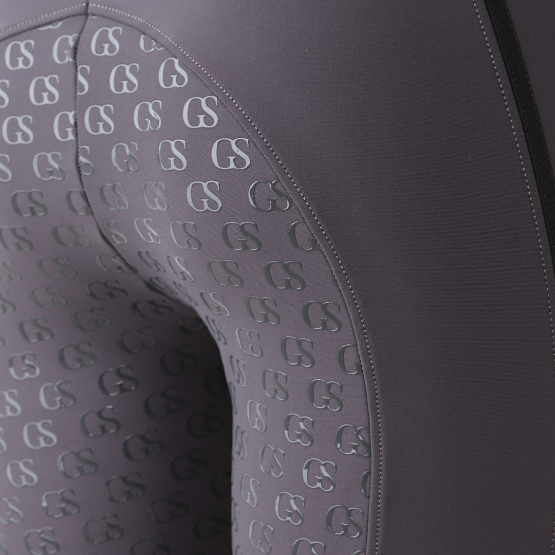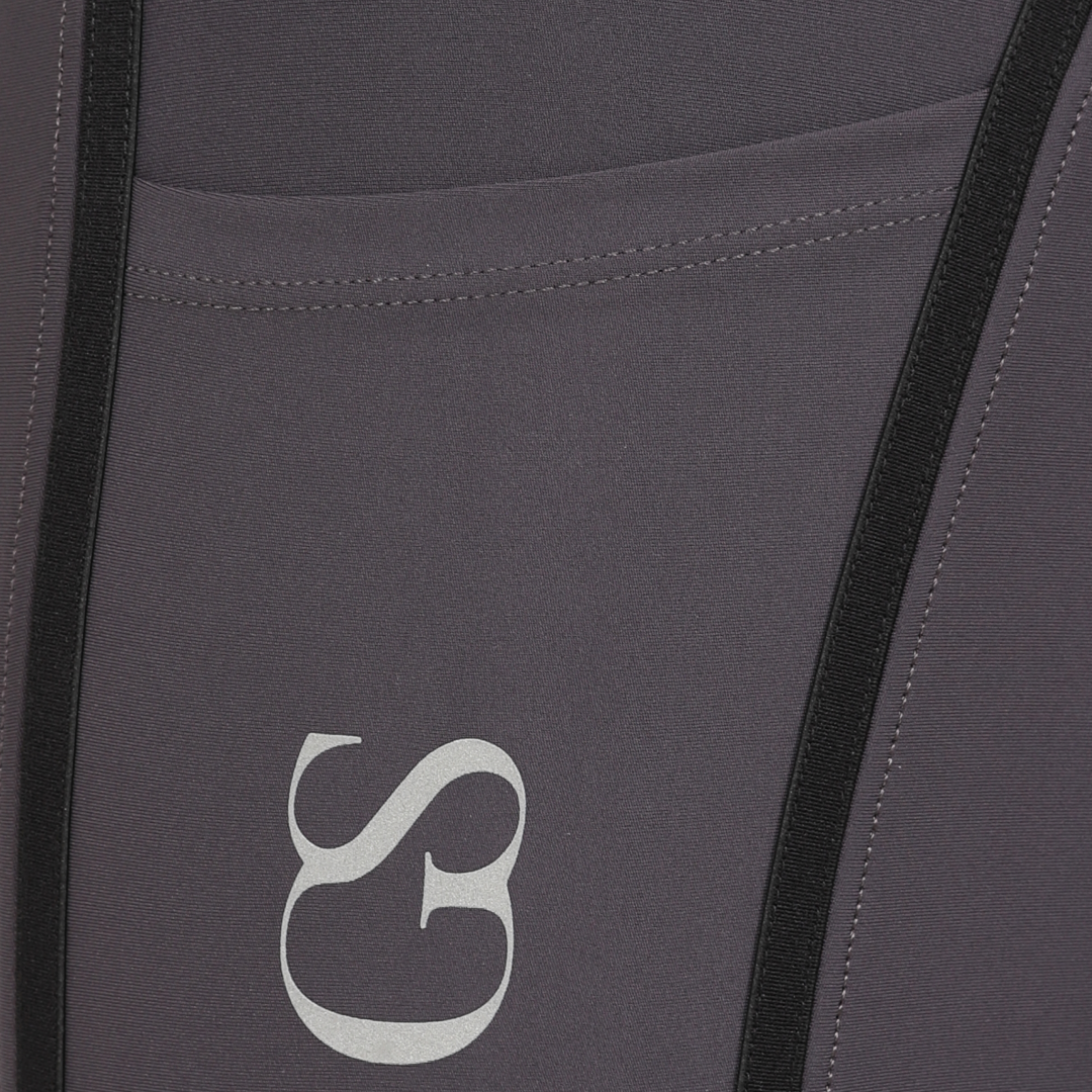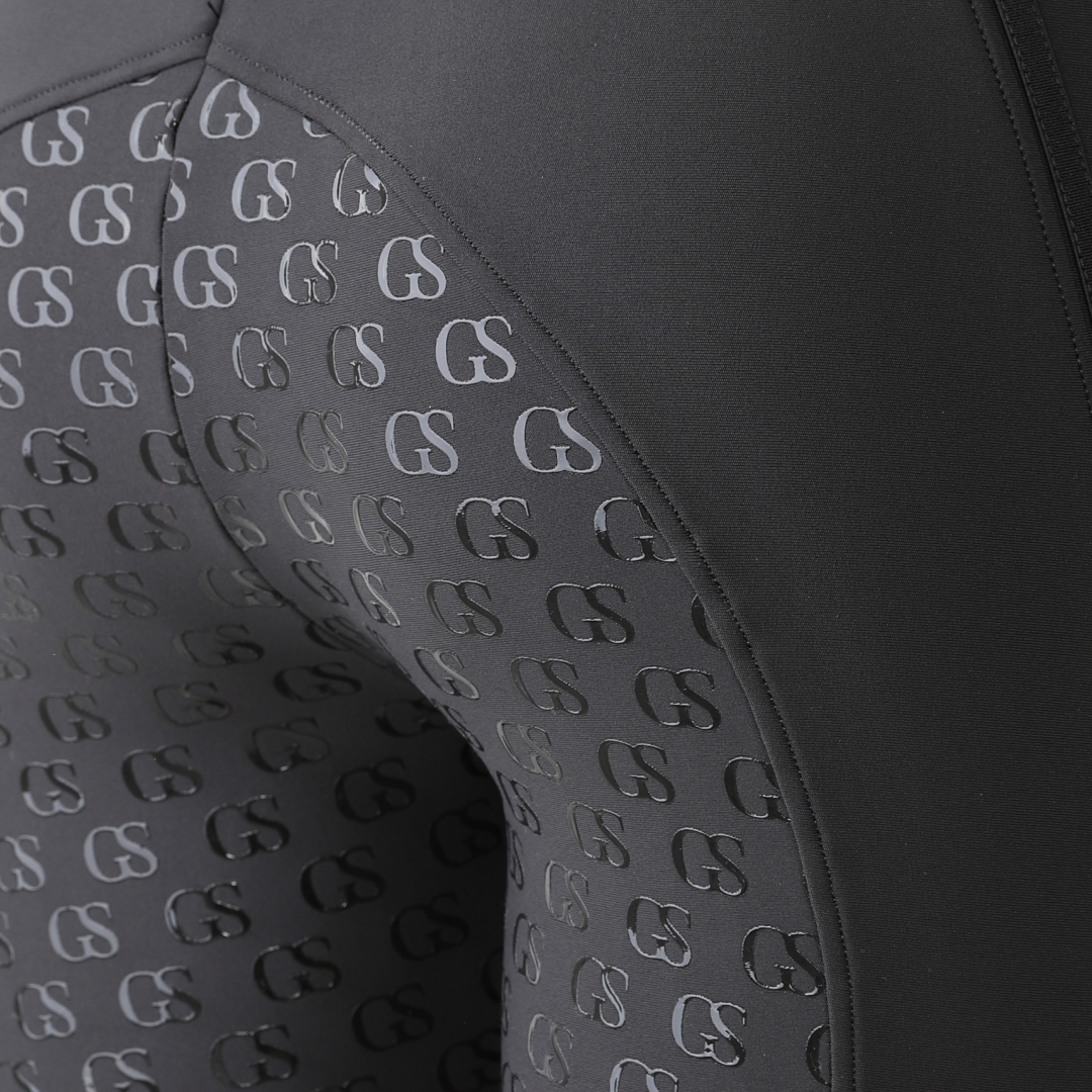 La poignée en silicone à motif « GS » est nouvelle dans la gamme GS Equestrian et offre un look élégant, tout en étant efficace. Étant un collant d'équitation à fond intégral, le silicone est coloré de la même couleur que le collant d'équitation, ce qui se fond dans le design élégant, car il recouvre une grande partie du collant d'équitation. De plus, il y a un logo GS sur la jambe gauche, situé sur la poche du téléphone, qui a une touche réfléchissante.