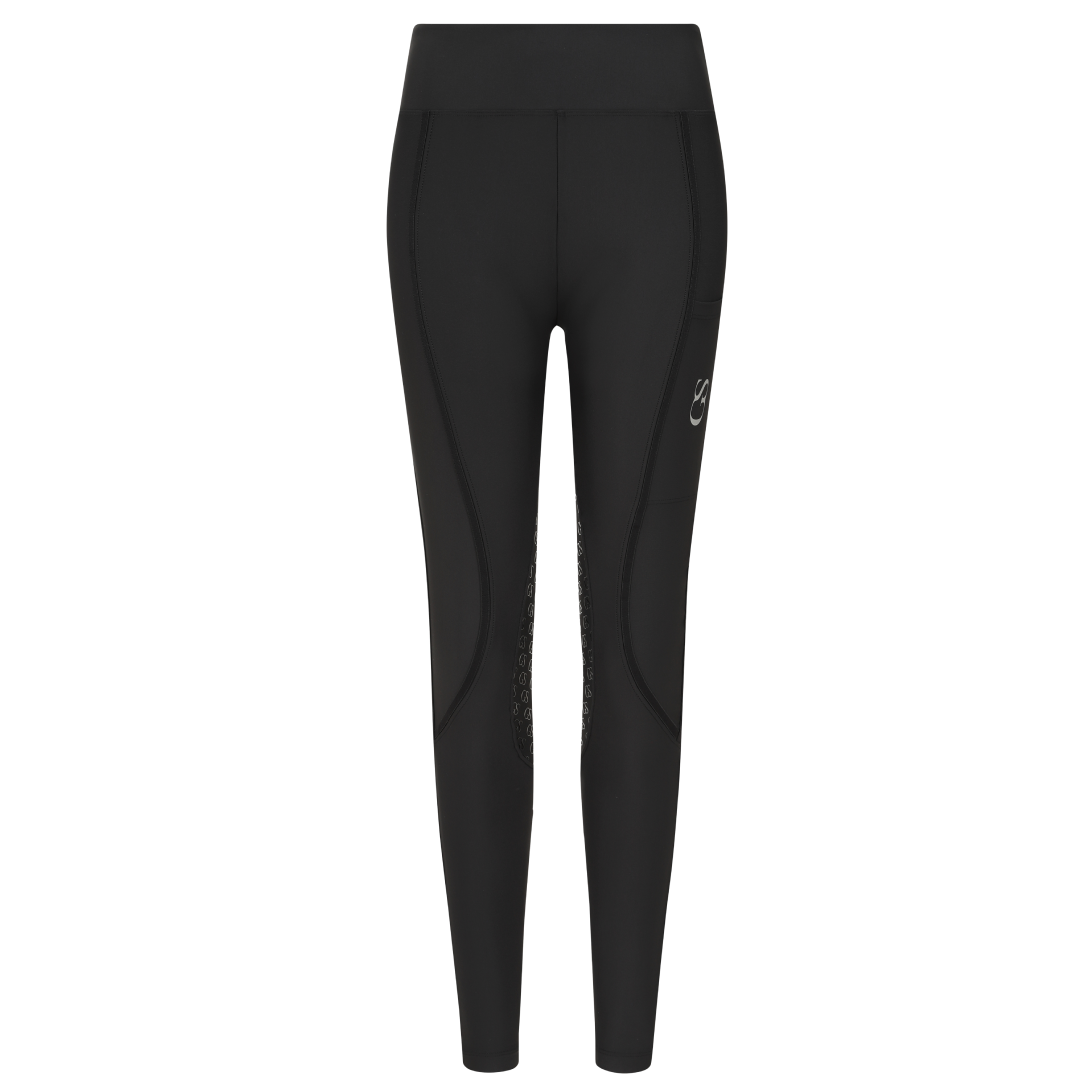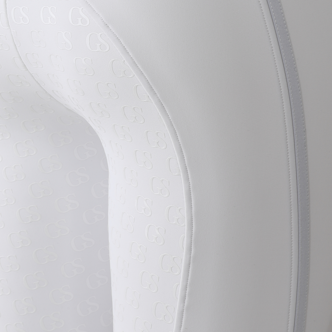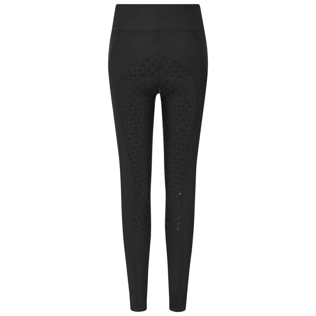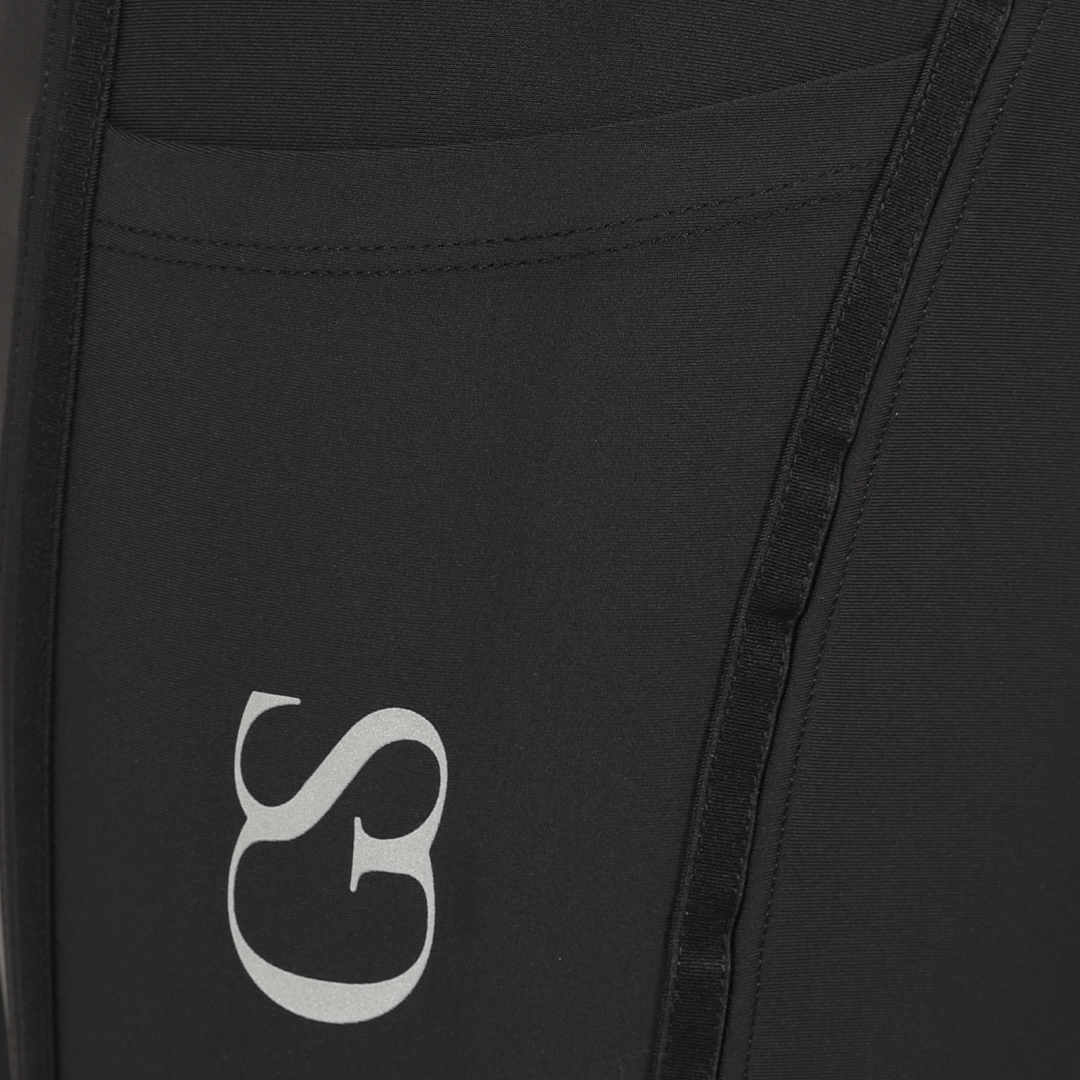 La poignée en silicone à motif « GS » est nouvelle dans la gamme GS Equestrian et offre un look élégant, tout en étant efficace. Étant un collant d'équitation à fond intégral, le silicone est coloré de la même couleur que le collant d'équitation, ce qui se fond dans le design élégant, car il recouvre une grande partie du collant d'équitation. De plus, il y a un logo GS sur la jambe gauche, situé sur la poche du téléphone, qui a une touche réfléchissante.