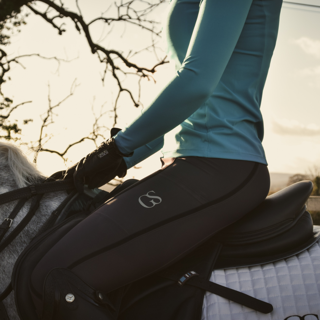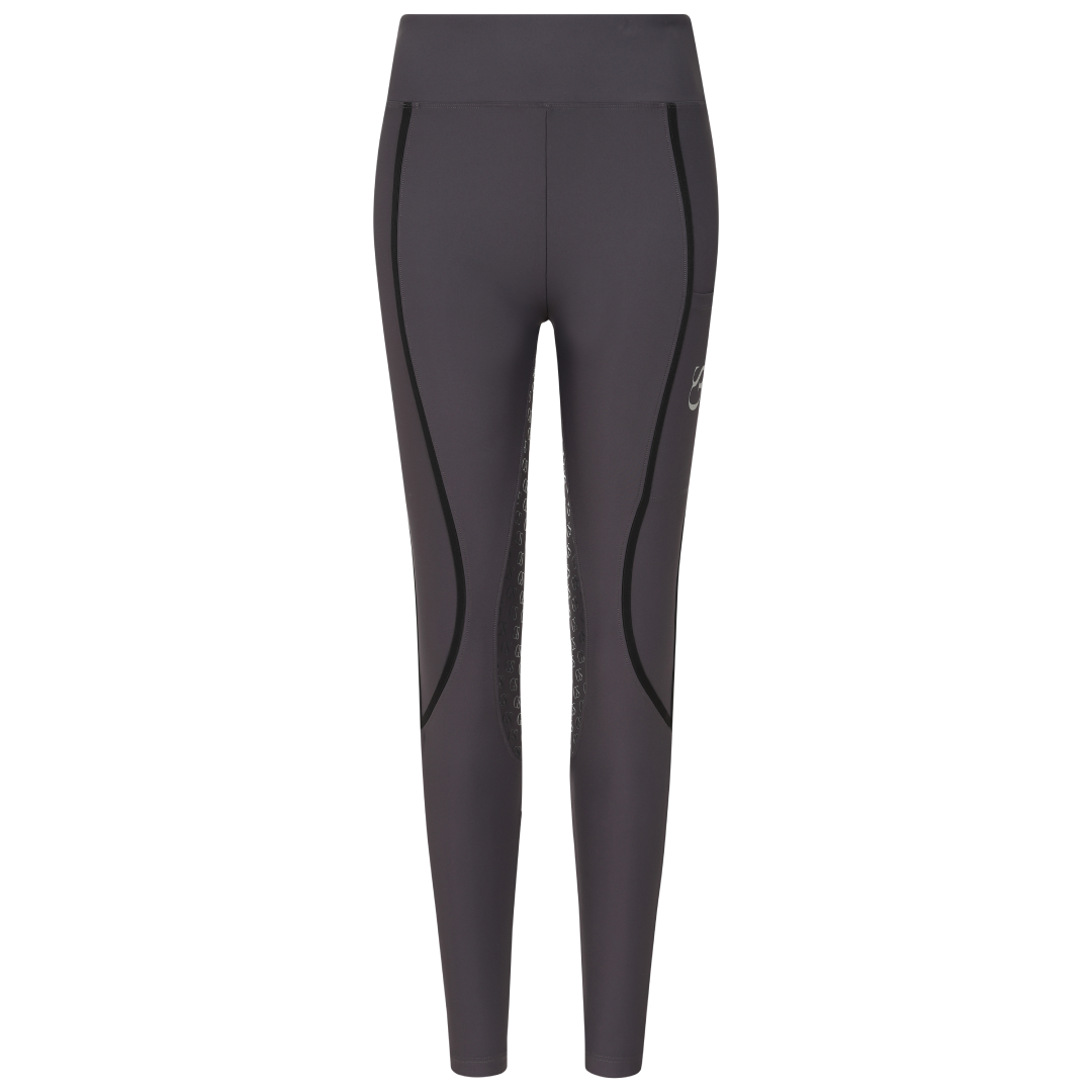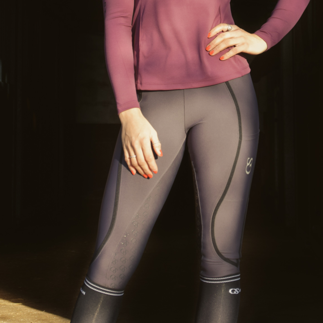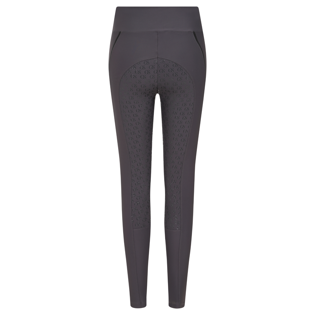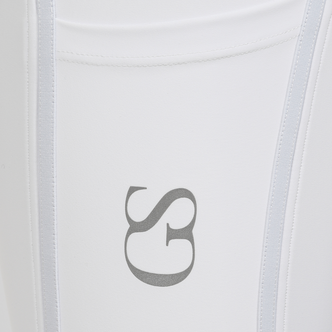 La poignée en silicone à motif « GS » est nouvelle dans la gamme GS Equestrian et offre un look élégant, tout en étant efficace. Étant un collant d'équitation à fond intégral, le silicone est coloré de la même couleur que le collant d'équitation, ce qui se fond dans le design élégant, car il recouvre une grande partie du collant d'équitation. De plus, il y a un logo GS sur la jambe gauche, situé sur la poche du téléphone, qui a une touche réfléchissante.