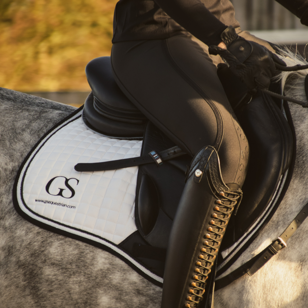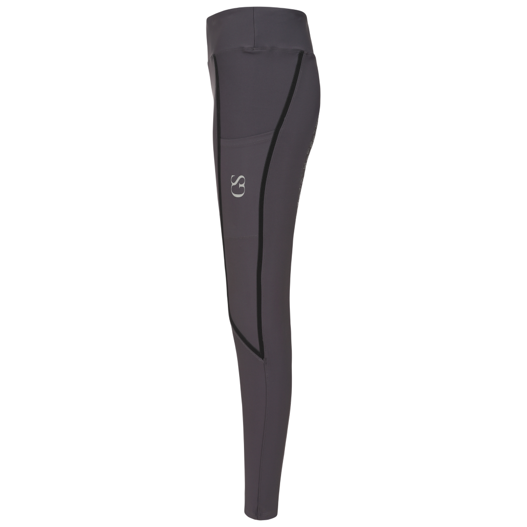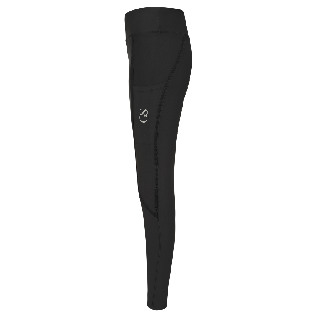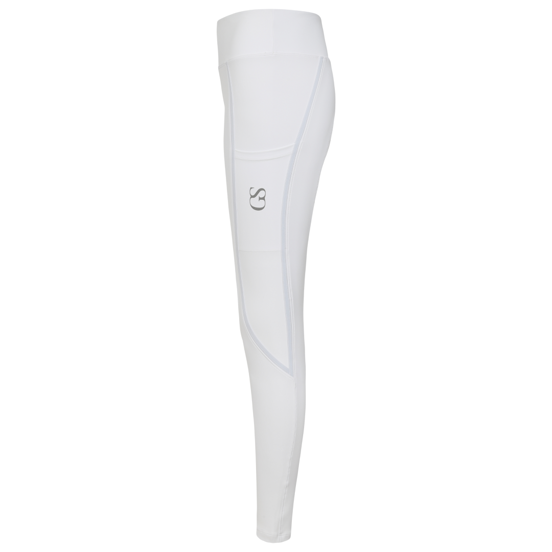 La poignée en silicone à motif « GS » est nouvelle dans la gamme GS Equestrian et offre un look élégant, tout en étant efficace. Étant un collant d'équitation à fond intégral, le silicone est coloré de la même couleur que le collant d'équitation, ce qui se fond dans le design élégant, car il recouvre une grande partie du collant d'équitation. De plus, il y a un logo GS sur la jambe gauche, situé sur la poche du téléphone, qui a une touche réfléchissante.