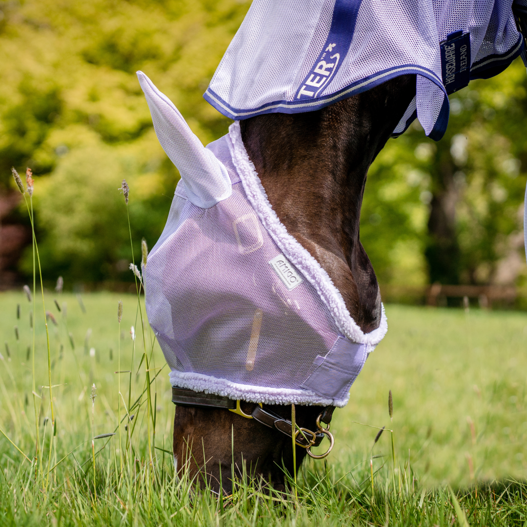 - Profilé pour s'adapter parfaitement à la tête de votre cheval, réduit les irritations causées par les mouches et reflète la lumière du soleil. Disponible dans une série de couleurs pour compléter la gamme de tapis. Les grandes oreilles souples protègent des mouches.
