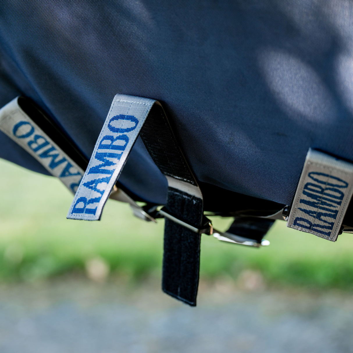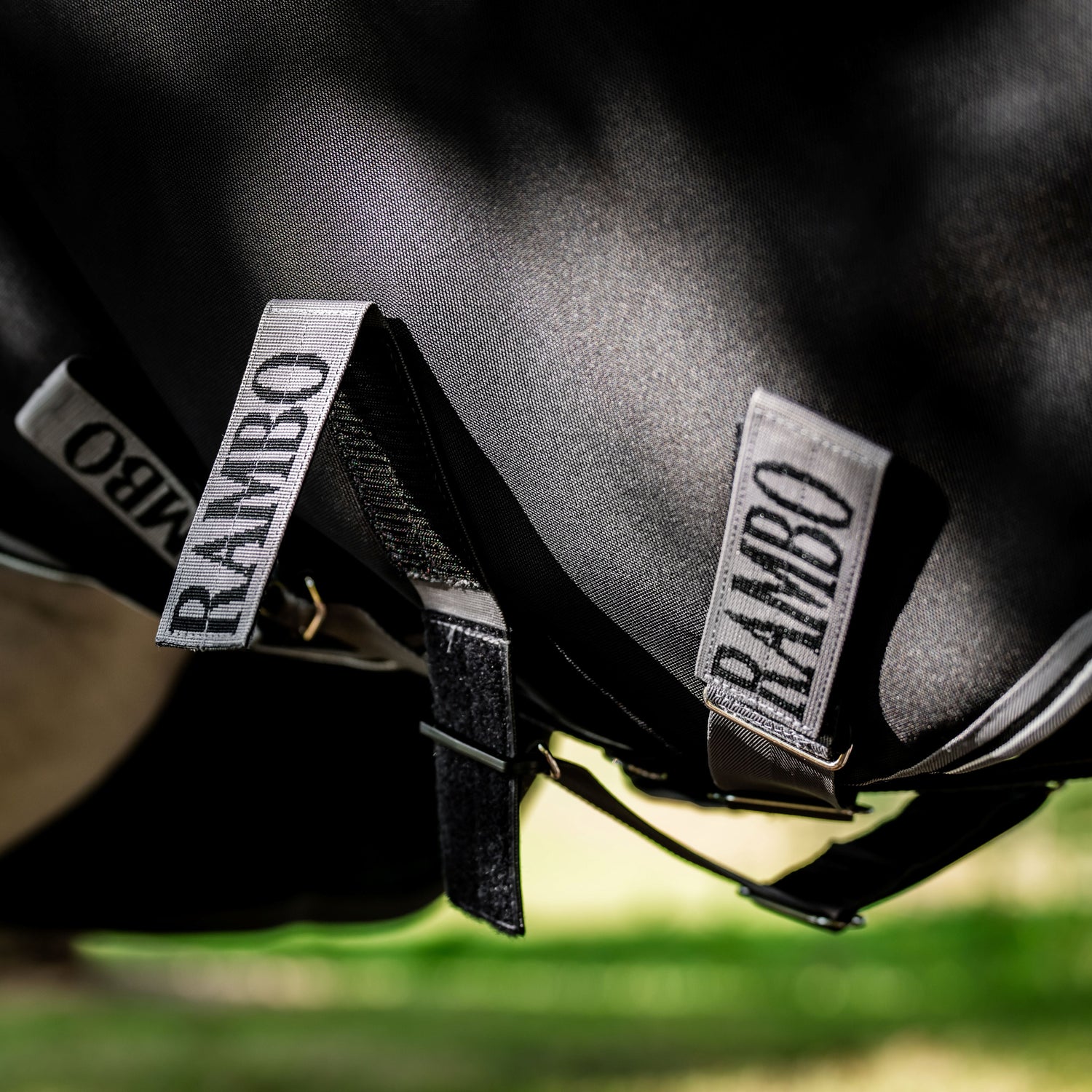 Additional details include reflective strips for increased visibility, a waterproof tail flap for added protection, a wipe-clean tail cord, three crossed webbing surcingles with the Rambo® Safety Surcingle System for a secure fit, a Velcro sandwich hood attachment for optional hood compatibility, and leg strap compatibility for additional stability. The anti-static, anti-bacterial lining enhances both the comfort and hygiene of the rug.