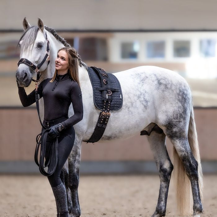 Extra soft lunging surcingle, which provides the horse with a high degree of comfort. The girth circumference is easily adjustable with the aid of both roller buckles. With 12 rings for individual lunging management. With rose gold fittings